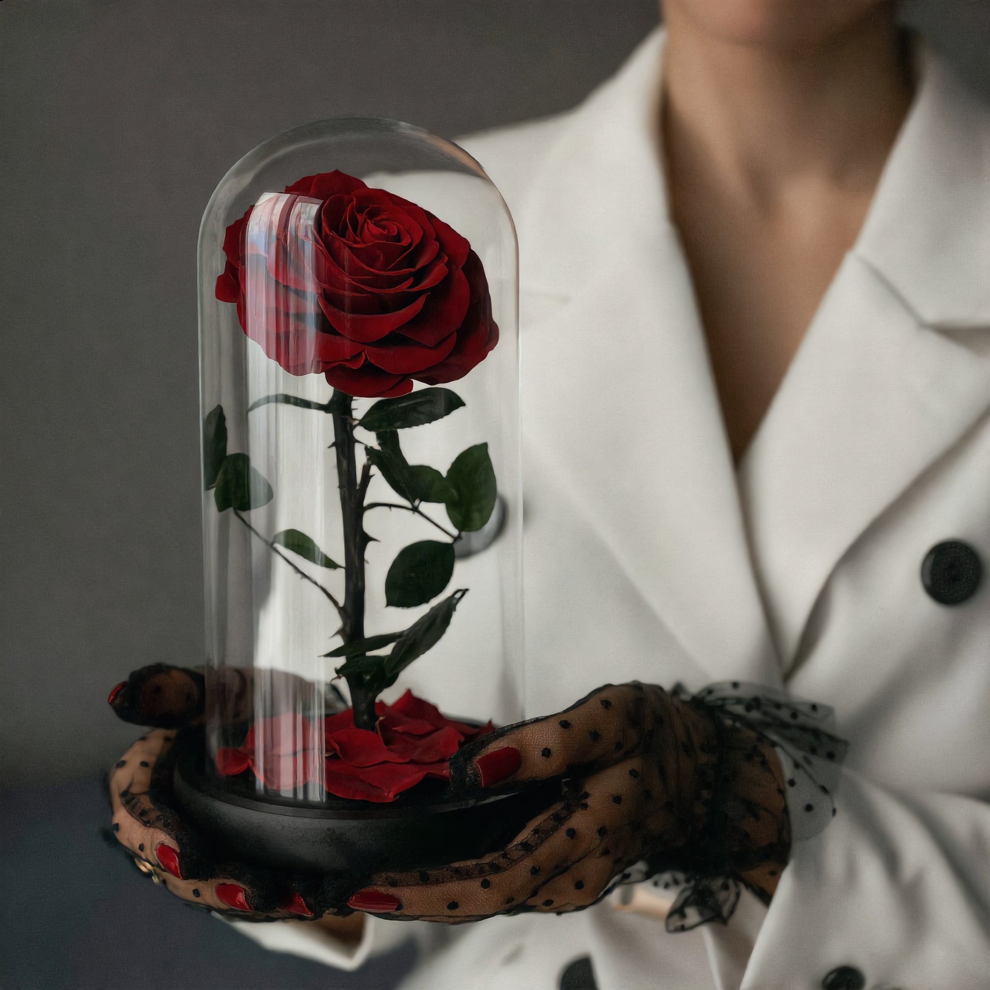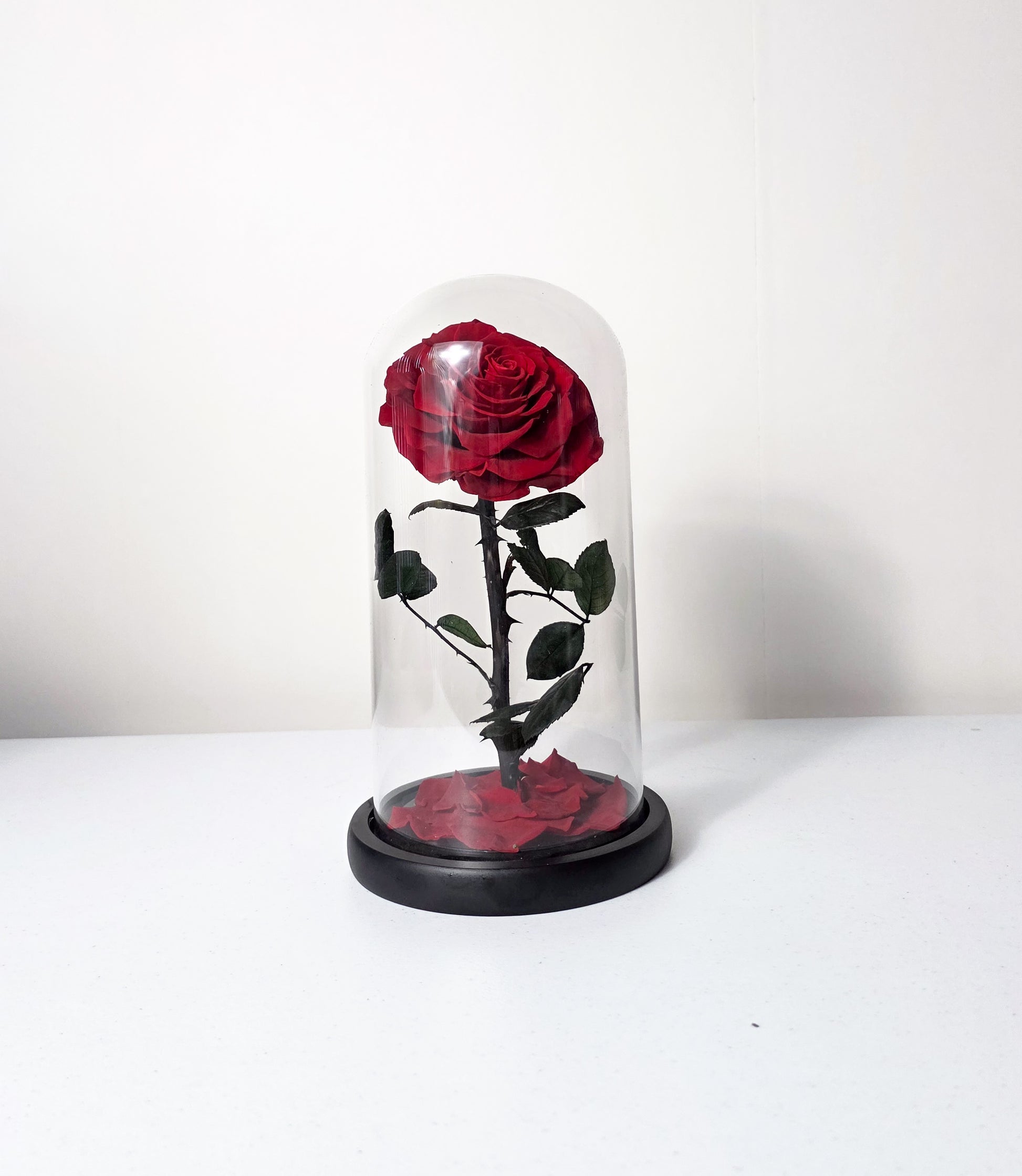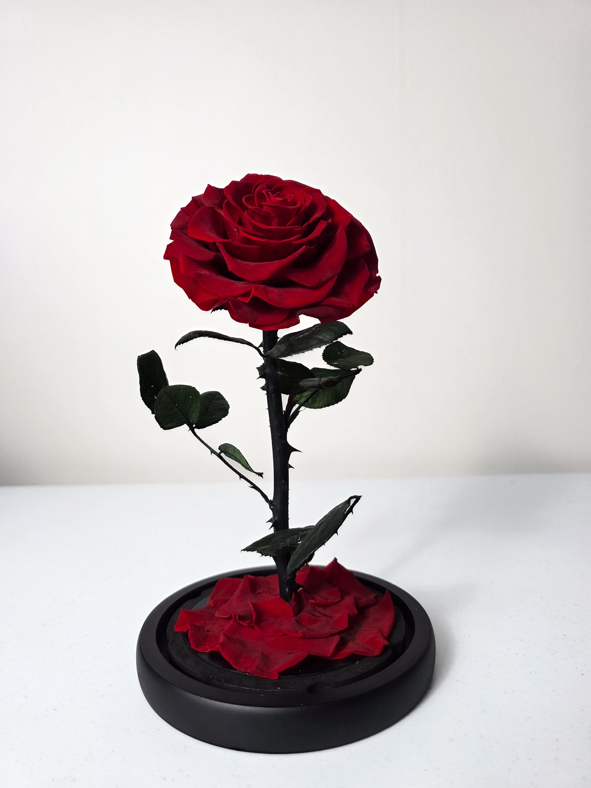 This single preserved rose captures the essence of eternal love and devotion. Encased in a crystal-clear glass dome, the rose stands tall and radiant, symbolizing a bond that never fades.